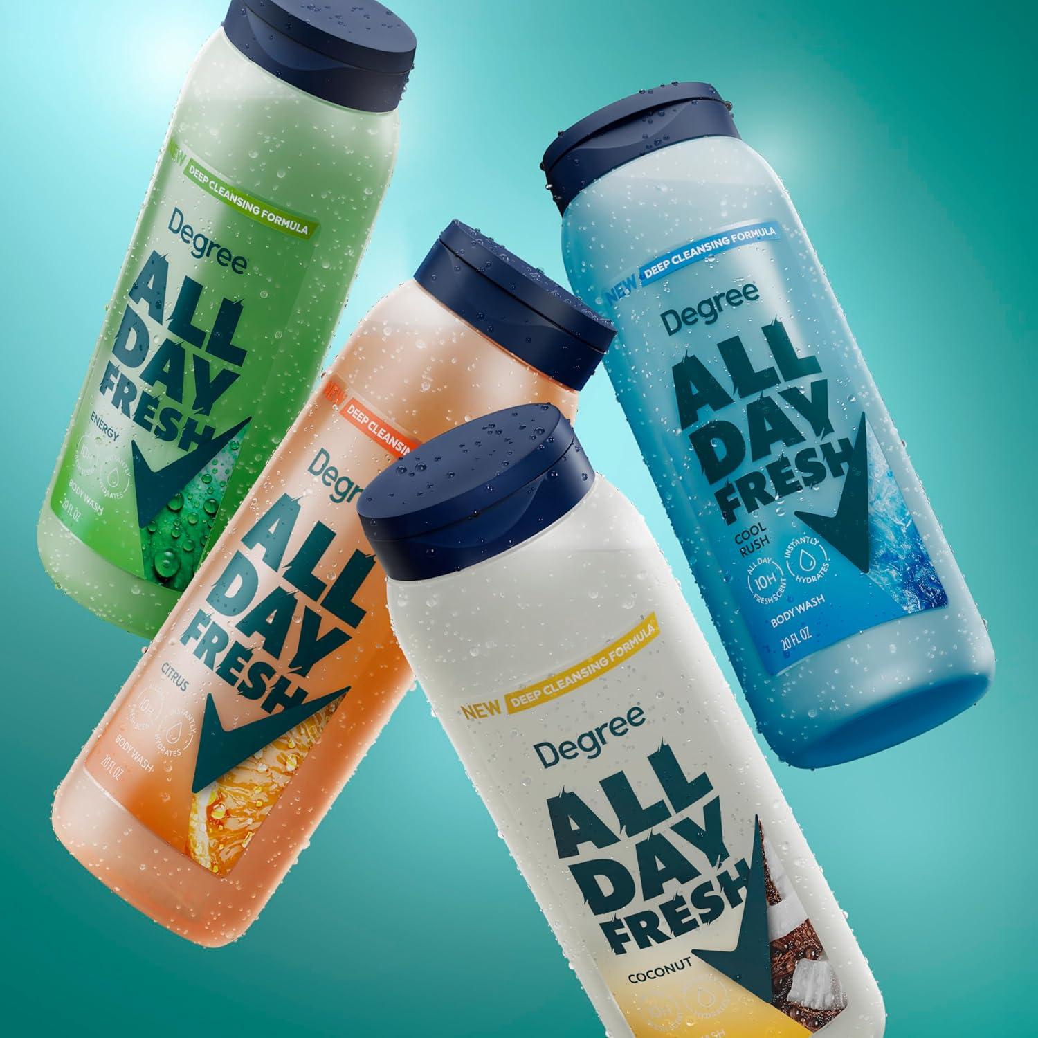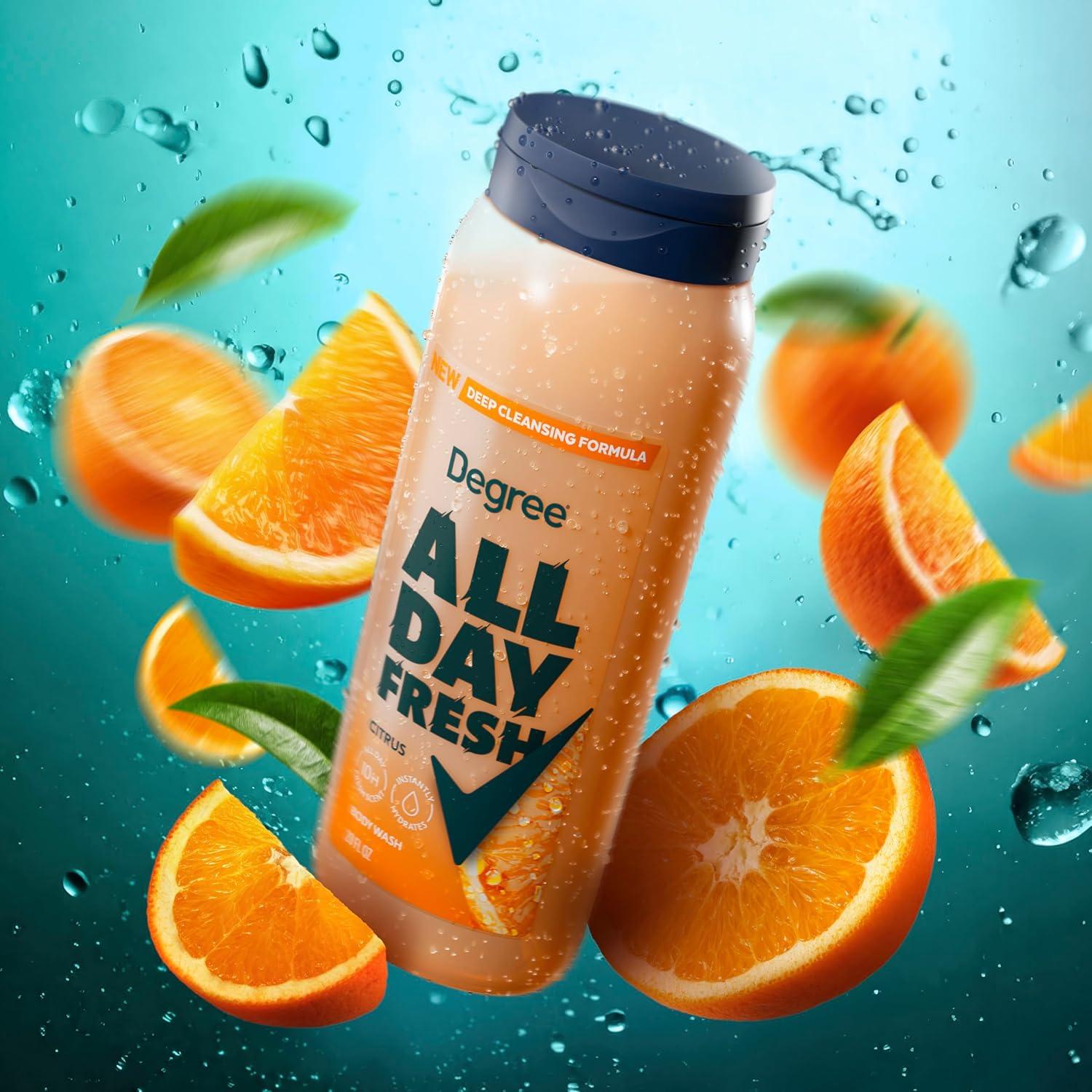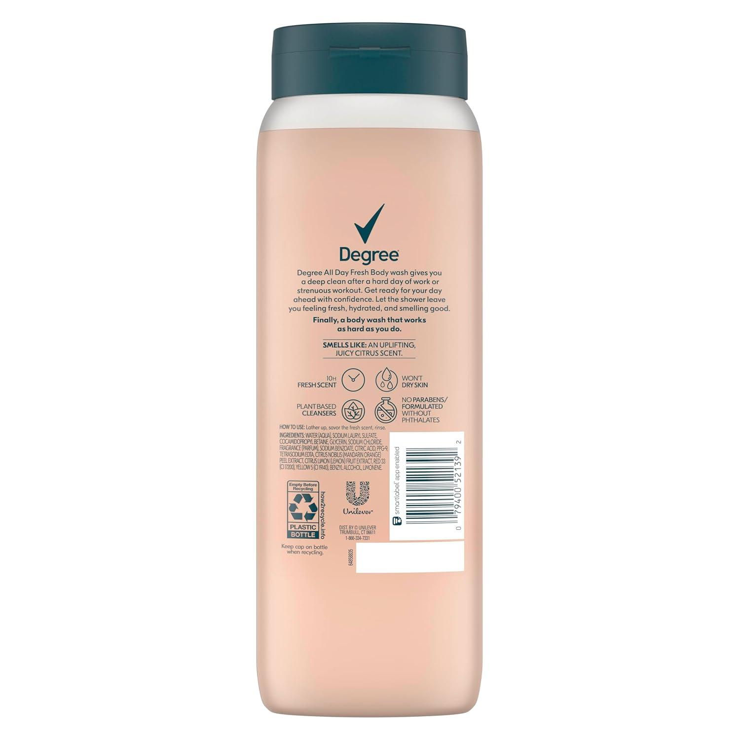 Brought to you by America's #1 deodorant brand is NEW! Degree All Day Fresh Body Wash. Degree body wash was purposefully formulated to complete your freshness routine alongside your favorite Degree deodorant. Degree All Day Fresh body wash features a deeply cleansing, instantly hydrating formula complete with gentle plant-based cleansers to remove dirt, sweat, and grime after a hard day at work or a strenuous workout. Its uplifting dewy citrus scent is intentionally designed to keep you fresh for up to 10 hours. Degree All Day Fresh will have you leaving the shower feeling fresh, hydrated, and smelling good — because deodorizing starts in the shower!