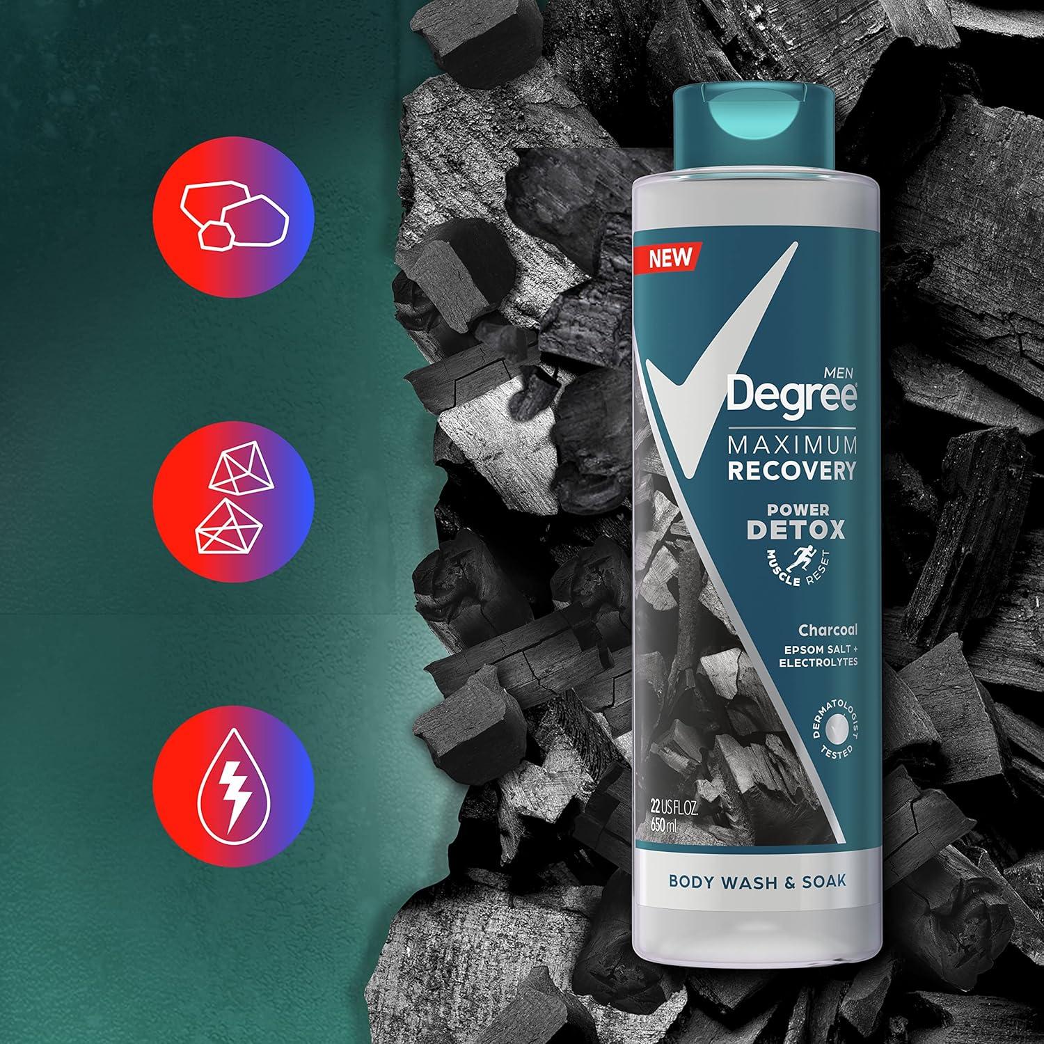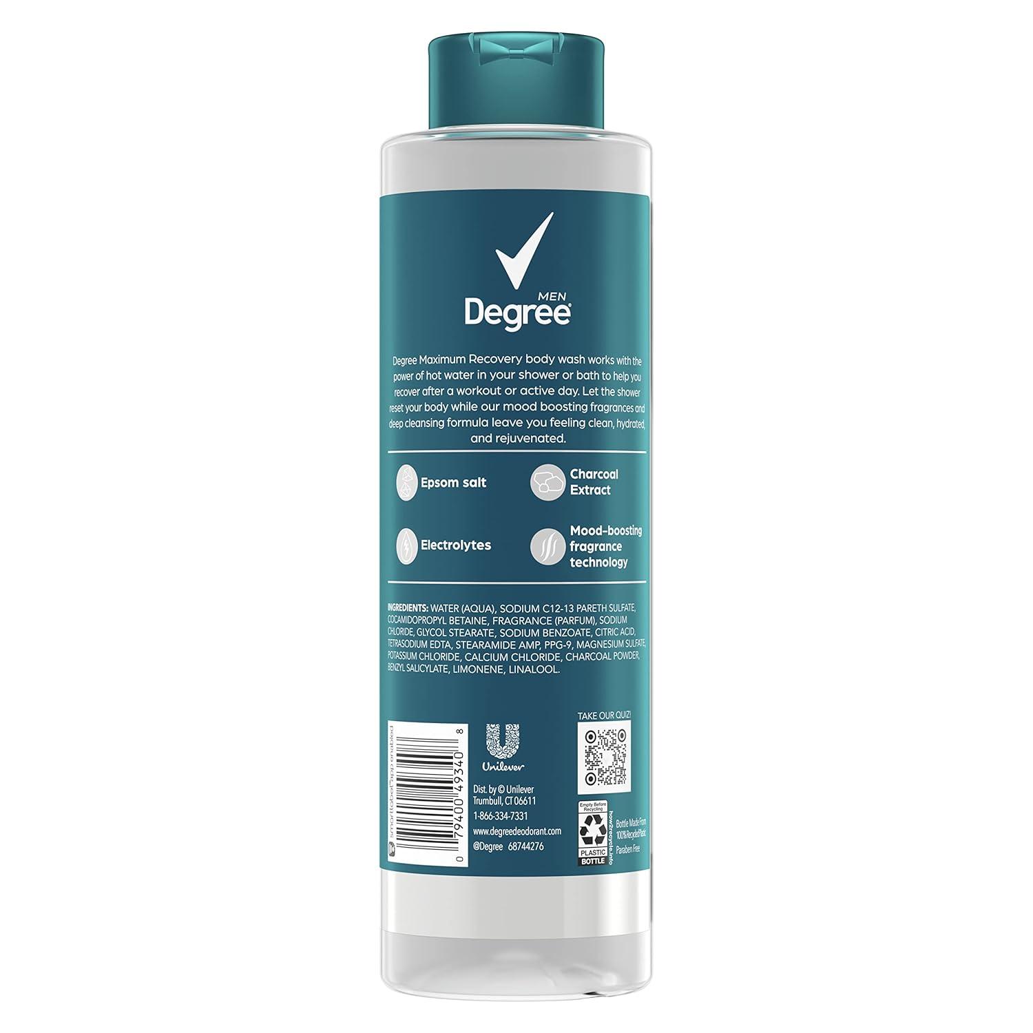 After putting your body to work, give it the recovery it deserves, starting with your post-workout shower. Specially formulated for active people, Degree Maximum Recovery Charcoal Body Wash and Soak works with the power of hot water in your shower to help you reset your muscles and tackle total body recovery with every shower. With Epsom Salt, Electrolytes, and Charcoal, this Body Wash and Soak features mood-boosting fragrance technology that delivers a refreshing Charcoal scent to your shower experience, helping you feel rejuvenated and prepared for whatever is next. Whether you're taking a post-workout shower or starting off your day, the deep cleansing formula of Degree Maximum Recovery Body Wash and Soak washes away germs and bacteria while leaving your skin feeling clean and hydrated. Simply lather the shower gel with hot water to let your muscles relax and stiffness disappear. Dermatologist tested, paraben-free, and a bottle made of 100 percent recycled plastic. Ready to level up your shower game and skin care routine with Degree bath and body products? Whatever you do, however you do it, Degree wants to help inspire the confidence in you to move more, the more you recover, the more you move, and this body wash and soak gives you the power to keep moving.