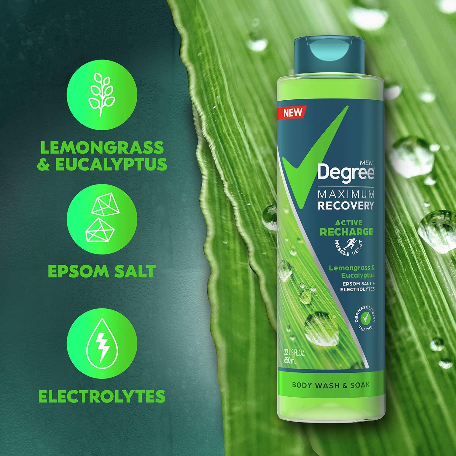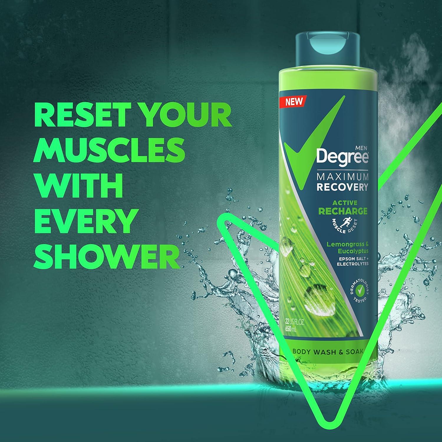 Level-up your shower. Degree Men Maximum Recovery Lemongrass and Eucalyptus Body Wash and Soak works with the power of hot water in the shower to help you boost recovery after a workout or active day