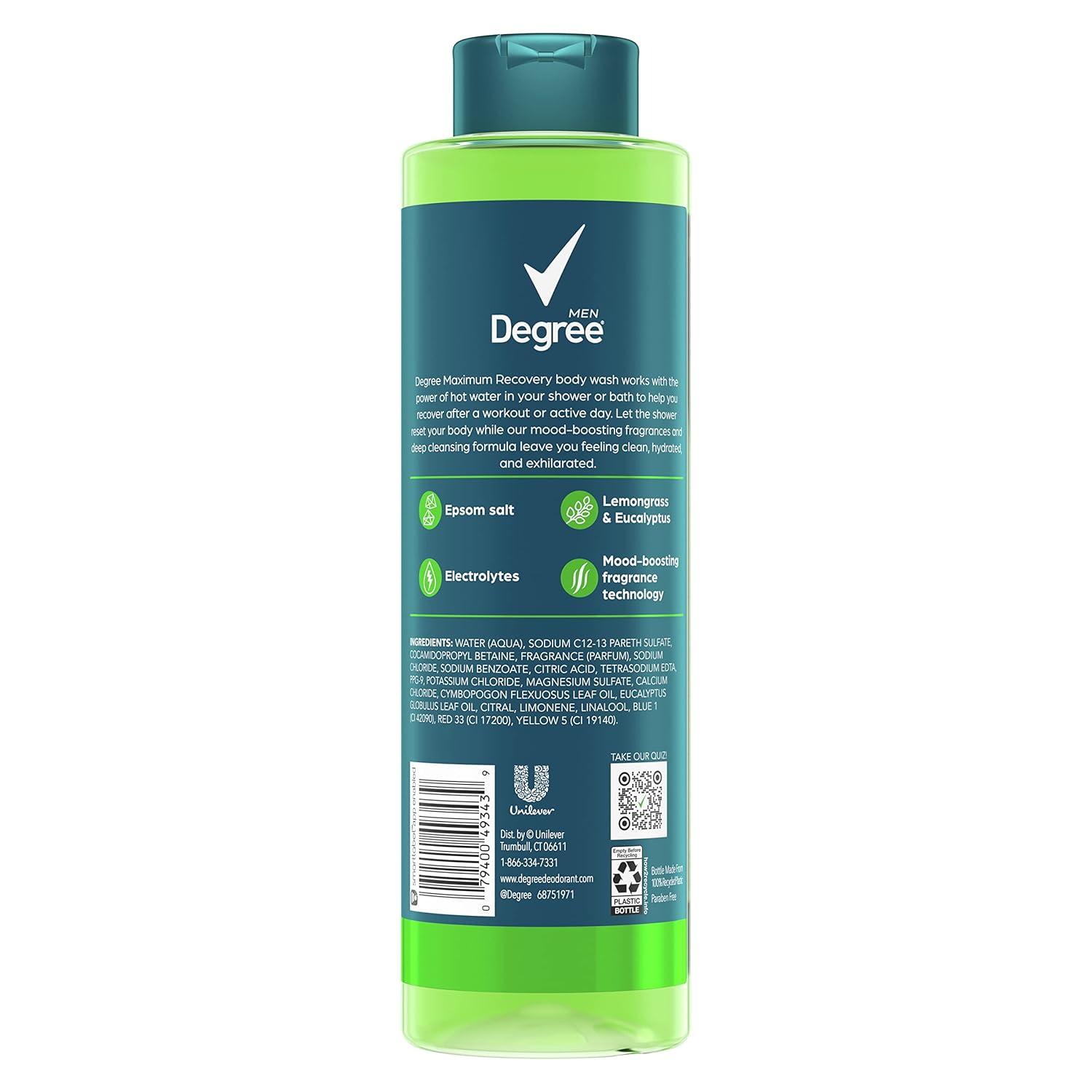After putting your body to work, give it the recovery it deserves, starting with your post-workout shower. Specially formulated for active people, Degree Men Maximum Recovery Lemongrass and Eucalyptus Body Wash and Soak works with the power of hot water in your shower to help you reset your muscles and tackle total body recovery with every shower. With Lemongrass and Eucalyptus, Epsom Salt, and Electrolytes, this Body Wash and Soak features mood-boosting fragrance technology that delivers an invigorating scent to your shower experience, helping you feel exhilarated and prepared for whatever is next. Whether you're taking a post-workout shower or starting off your day, the deep cleansing formula of Degree Maximum Recovery Body Wash and Soak washes away germs and bacteria while leaving your skin feeling clean and hydrated. Simply lather the shower gel with hot water to let your muscles relax and stiffness disappear. Dermatologist tested, paraben-free, and a bottle made of 100 percent recycled plastic. Ready to level up your shower game and skin care routine with Degree bath and body products? Whatever you do, however you do it, Degree wants to help inspire the confidence in you to move more, the more you recover, the more you move, and this body wash and soak gives you the power to keep moving.